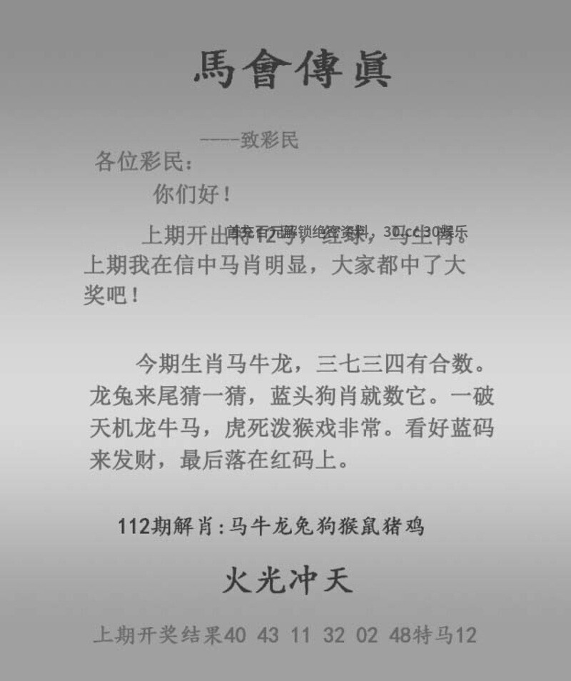 112期马会传真: 今期生肖马牛龙,三七三四有合数。龙兔来尾猜一猜,蓝头狗肖就数它。一破天机龙牛马,虎死泼猴戏非常。看好蓝码来发财,最后落在红码上。 火光冲天 特围生肖:马牛龙兔狗猴鼠猪鸡 |
